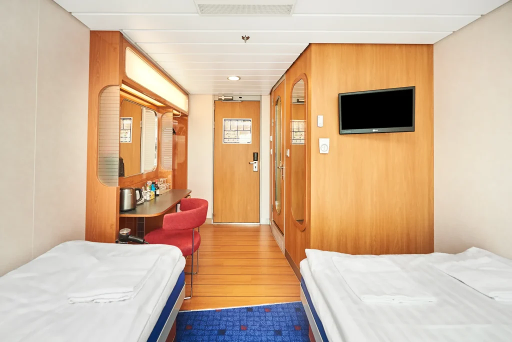 De standaard hutten (zoals op de foto) zijn al prima en bieden wat je nodig hebt: bedden (eventueel stapelbed), genoeg ruimte en een en-suite badkamer. Zie ook op de foto's. Aan boord is er genoeg vermaak, dus verwacht je er niet te veel tijd door te brengen dan is dit zeker een helemaal prima optie waar je niets te kort komt.